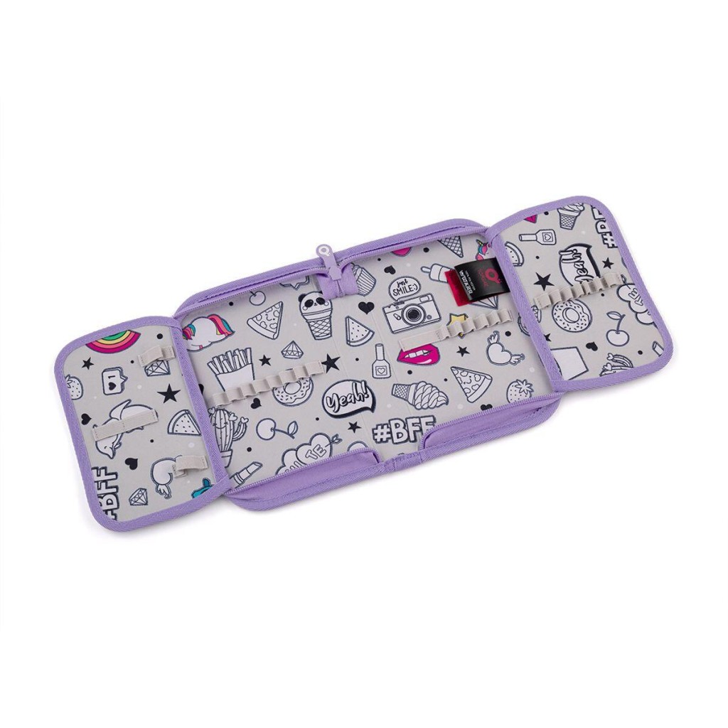 Jednoposchodový školský peračník s dvoma chlopňami je vybavené 21 klasickými gumovými úchytmi na pastelky a fixky, tromi širšími úchytmi na pravítko, kružidlo či nožnice a dvoma väčšími úchytmi na gumu a strúhadlo. Pod chlopňou z priehľadnej fólie nájdete rozvrh hodín, druhá poslúži napríklad aj na ťaháky.