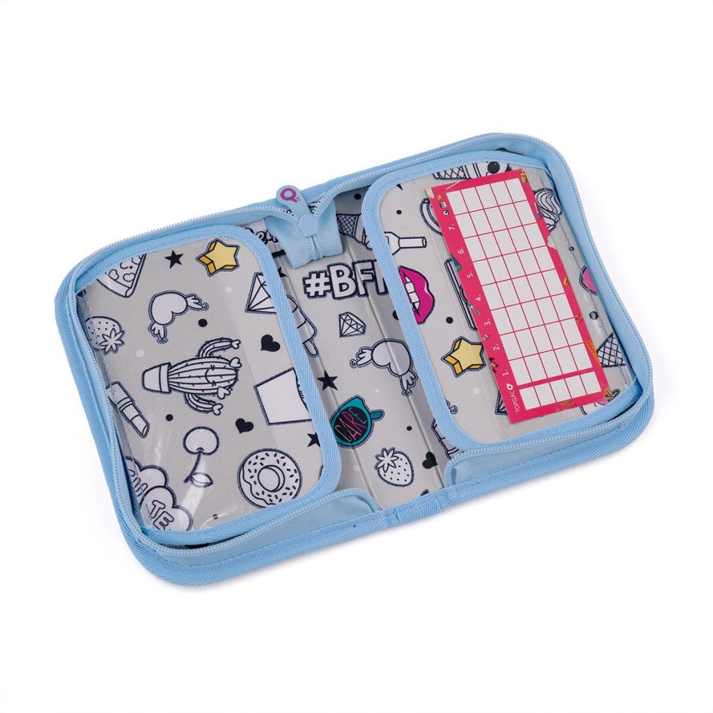 Jednoposchodový školský peračník s dvoma chlopňami je vybavené 21 klasickými gumovými úchytmi na pastelky a fixky, tromi širšími úchytmi na pravítko, kružidlo či nožnice a dvoma väčšími úchytmi na gumu a strúhadlo. Pod chlopňou z priehľadnej fólie nájdete rozvrh hodín, druhá poslúži napríklad aj na ťaháky.