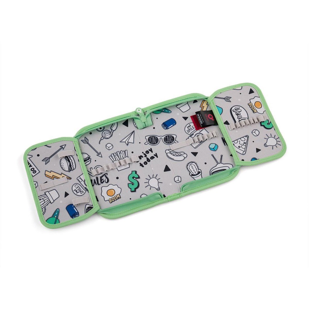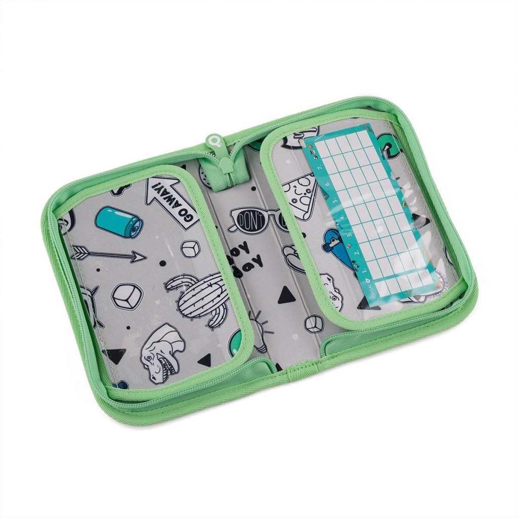 Jednoposchodový peračník do školy s dvoma chlopňami ponúka 21 elastických úchytov na pastelky a fixky, tri širšie na pravítko, kružidlo či nožnice a dva väčšie na gumu a strúhadlo. Pod priehľadnou fóliou nájdete rozvrh hodín, druhá môže slúžiť napríklad na poznámky alebo ťaháky.