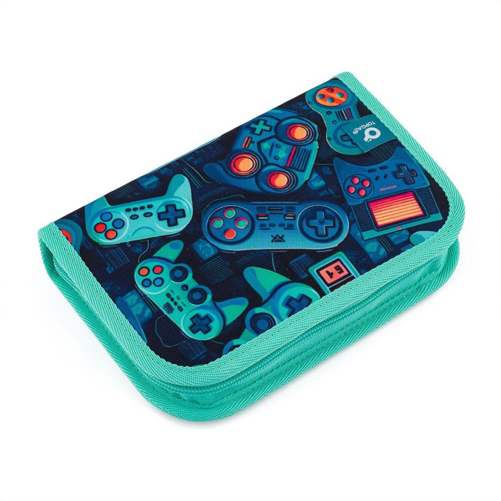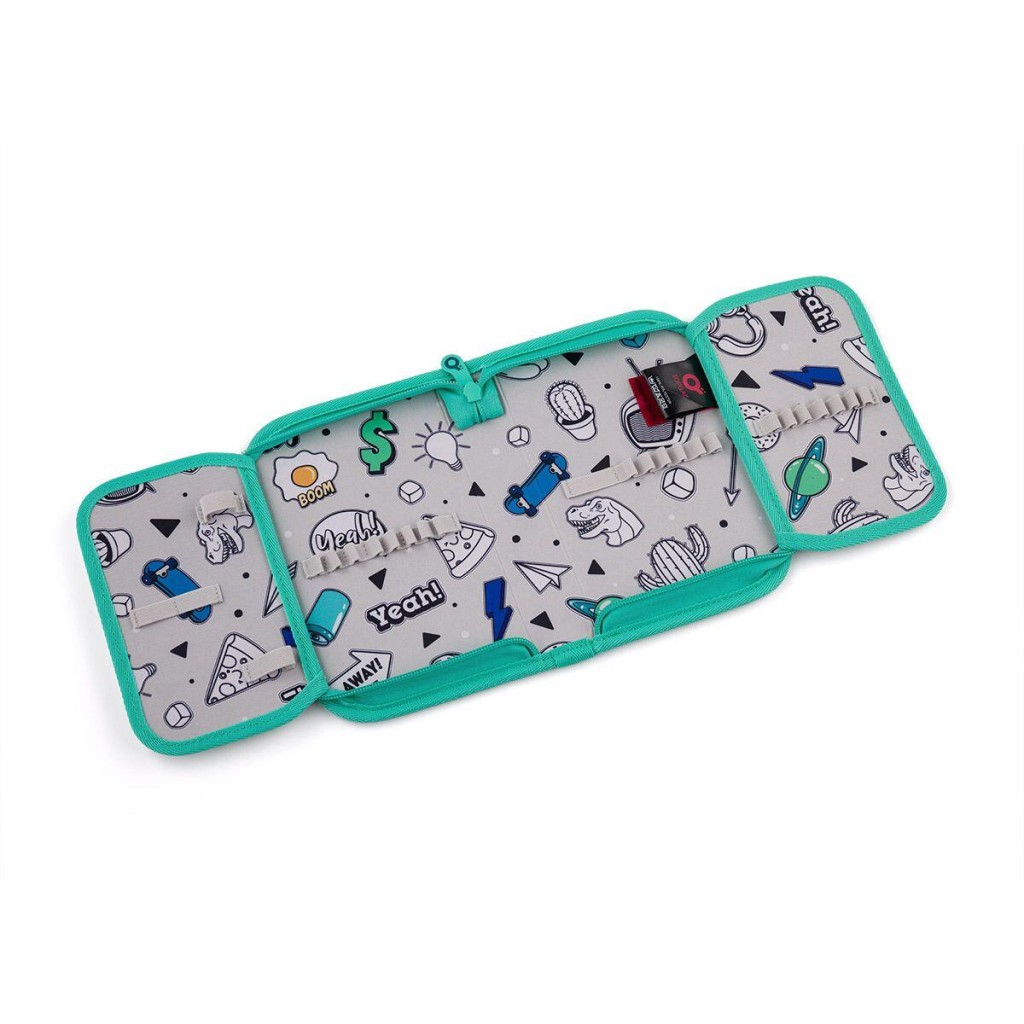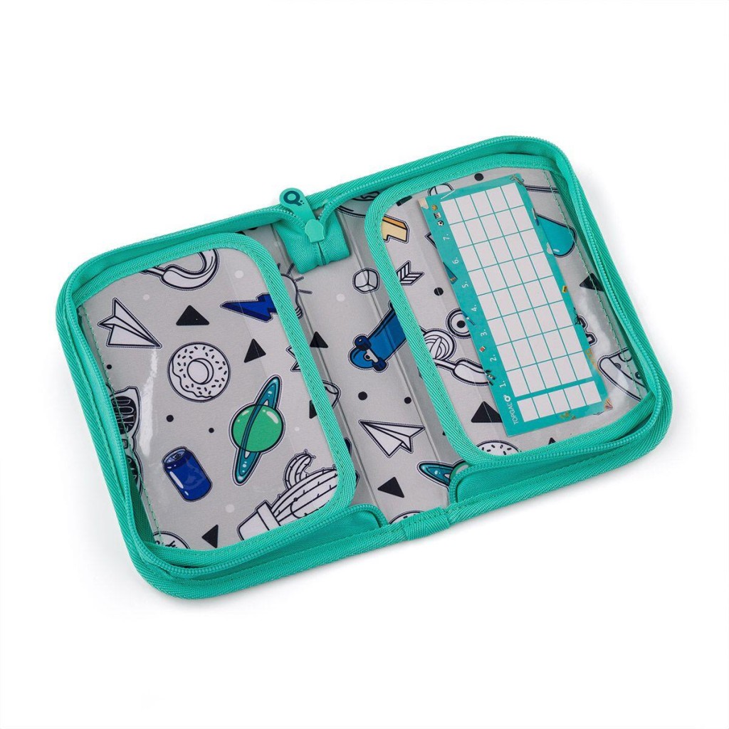 Jednoposchodový peračník do školy s dvoma chlopňami ponúka 21 elastických úchytov na pastelky a fixky, tri širšie na pravítko, kružidlo či nožnice a dva väčšie na gumu a strúhadlo. Pod priehľadnou fóliou nájdete rozvrh hodín, druhá môže slúžiť napríklad na poznámky alebo ťaháky.