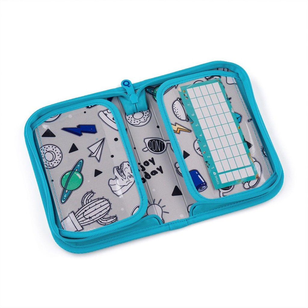 Jednoposchodový školský peračník s dvoma chlopňami je vybavený 21 klasickými gumovými úchytmi na pastelky a fixky, tromi širšími úchytmi na pravítko, kružidlo či nožnice a dvoma väčšími úchytmi na gumu a strúhadlo. Pod chlopňou z priehľadnej fólie nájdete rozvrh hodín, druhá poslúži napríklad aj na ťaháky.