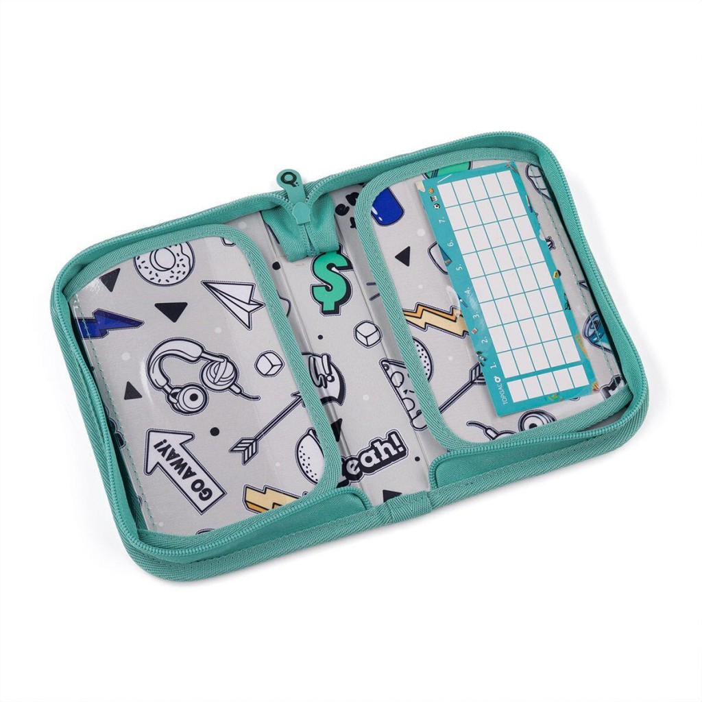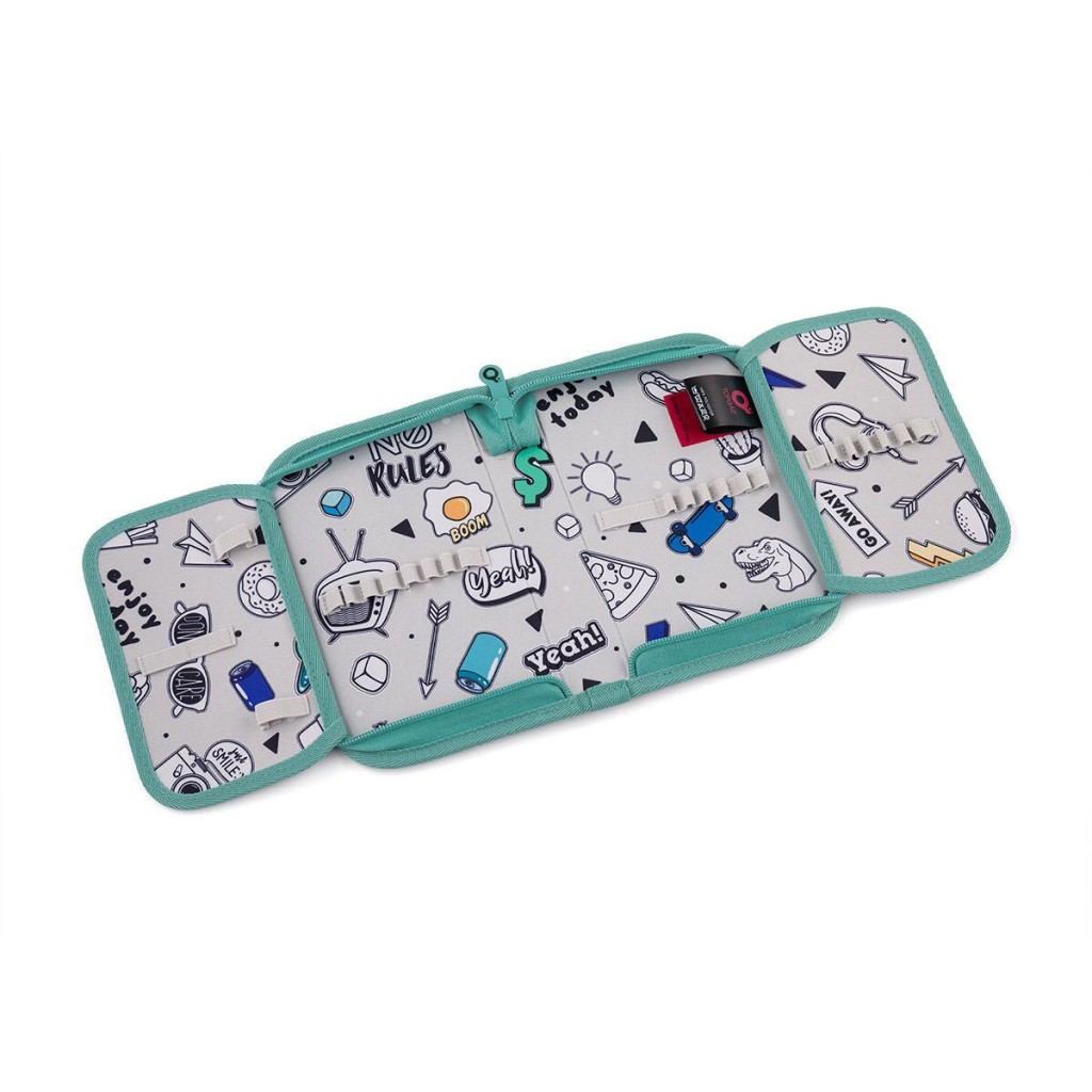 Jednoposchodový školský peračník s dvoma chlopňami je vybavený 21 klasickými gumovými úchytmi na pastelky a fixky, tromi širšími úchytmi na pravítko, kružidlo či nožnice a dvoma väčšími úchytmi na gumu a strúhadlo. Pod chlopňou z priehľadnej fólie nájdete rozvrh hodín, druhá poslúži napríklad aj na ťaháky.