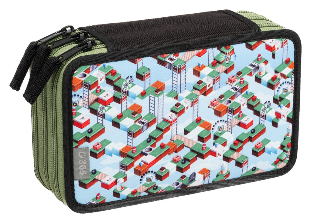 Trojposchodový peračník Stil Games pojme najviac písacích a školských potrieb. Prvé poschodie obsahuje 8 gumičiek na pastelky, 3 širšie gumičky na strúhadlo aj gumu a novo tiež sieťované vrecko s pružným lemom na uloženie drobností. Na druhom poschodí je umiestnené priehľadné vrecko na rozvrh a 10 pevných gumičiek na písacie potreby rôznych veľkostí. Tretia časť peračníka ponúka navyše ešte ďalších 15 gumičiek na ceruzky a 2 ďalšie širšie gumičky pre rôzne potreby. Penál je dokonale farebne zladený dizajn s aktovkou či batohom je samozrejmosťou. Peračník je bez náplne.