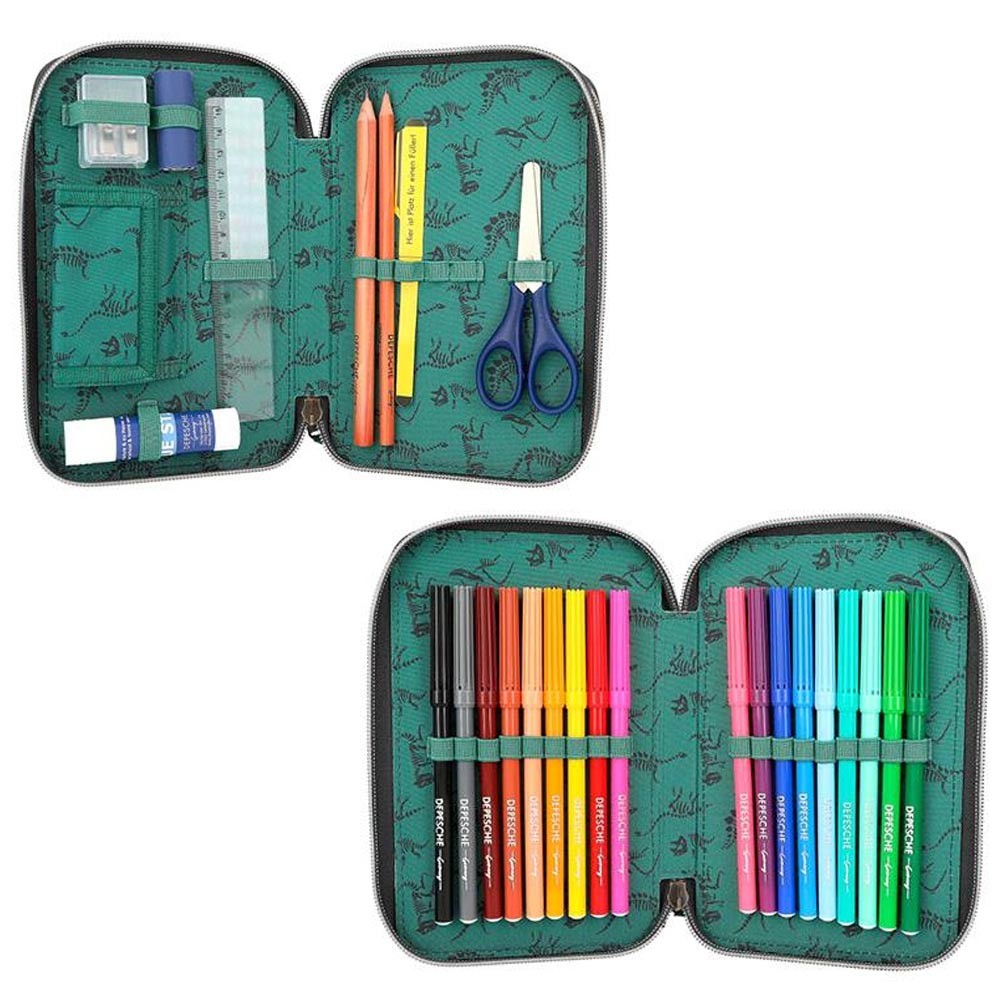 Praktický trojposchodový peračník vyrobený z kvalitného materiálu odolného proti bežnému opotrebovaniu. Jedinečná náplň peračníka ponúka - 2 ceruzky, 18 pasteliek, 18 fixiek, nožnice, lepidlo, pravítko, strúhadlo, gumu a zatváracie vrecko. Peračník do školy ponúka dostatočný vnútorný priestor postačujúci potrebám mladších aj starších školákov. Peračník má prednej strane vyobrazené dinosaura T-Rex, keď stlačíte označenú labu, rozsvieti sa pozadie. Spoľahlivé bezporuchové zapínanie na zips a originálny štýlový dizajn značky Dino World vytvorili z tohto peračníka obľúbenú školskú pomôcku. Materiálové zloženie: 100% polyester.