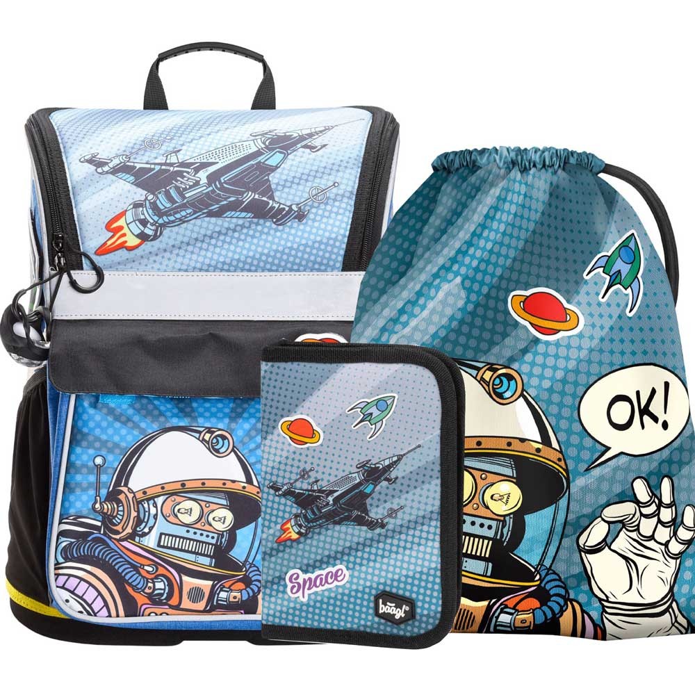 Školská aktovka pre chlapcov Baagl Zippy Spaceman je vhodná od 1. triedy ZŠ, odporúčame priemerne vysokým až vyšším prváčikom. Trojdielny set tvorí taška, peračník a vrecko na cvičky.