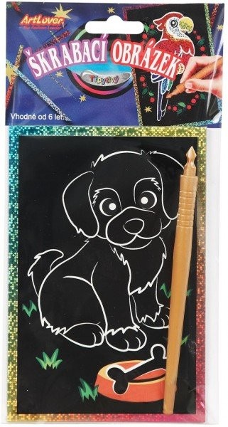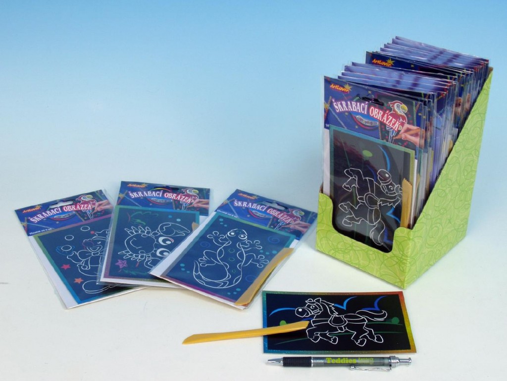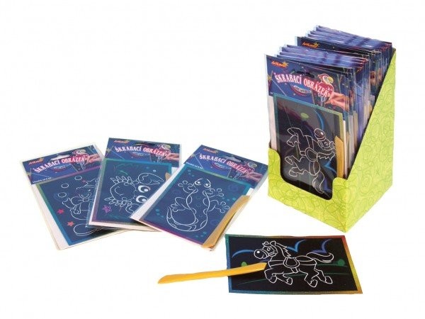Vhodné pre malé deti, neškriabe sa linky ale celý obrázok, podobne ako stierací žreb. Vznikne krásny farebný obrázok, ktorý sa pekne leskne. Vhodné od 3 rokov. Veľkosť obrázka 15 x 10 cm.