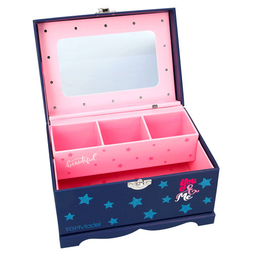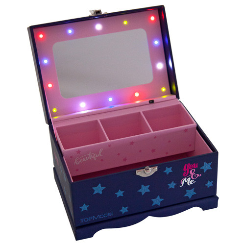Tak táto šperkovnica nesmie chýbať v žiadnej dievčenskoej izbičke! Nádherná šperkovnica uzatvárateľná horným vekom s kovovým zámkom, ktorého súčasťou je veľké zrkadlo lemované farebnými LED svetielkami. Tie po otvorení cca 20 sekúnd blikajú. Vyrobená z kvalitného pevného kartónu v jedinečnom dizajne mimoriadne obľúbenej značky Top Model.