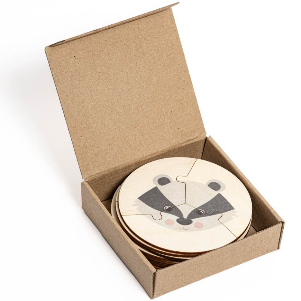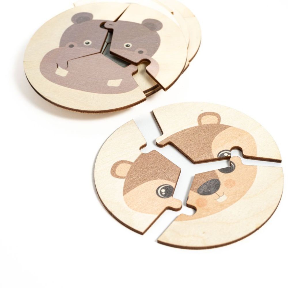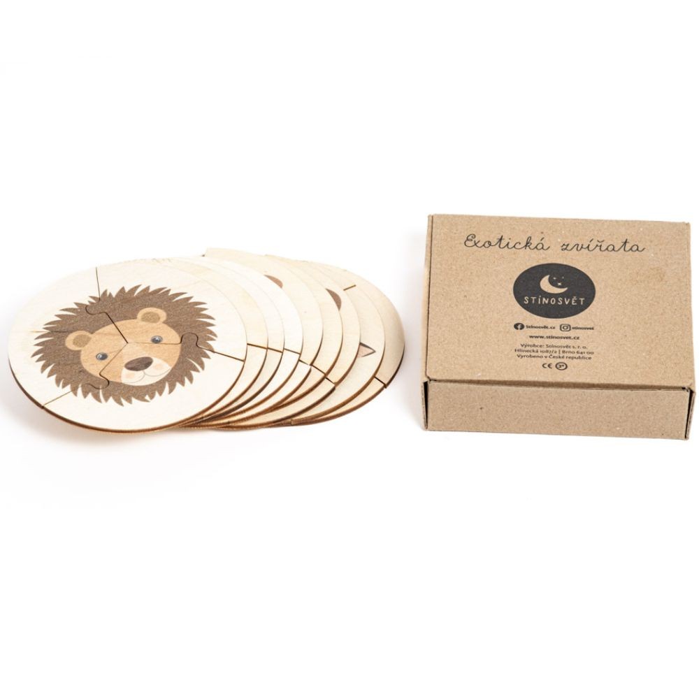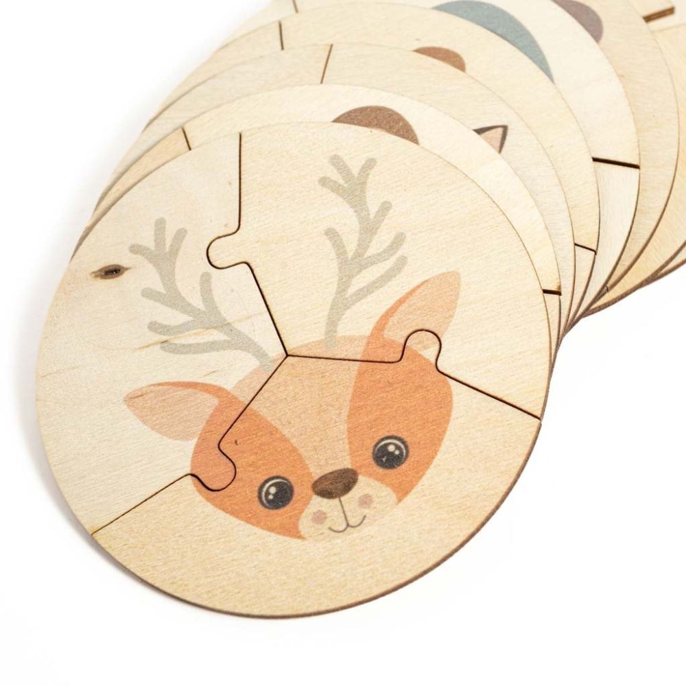 Krabička obsahuje 9 súprav drevených puzzle s priemerom 10 cm. Jedna súprava sa skladá z 3 dielikov. Hra s puzzle rozvíja jemnú motoriku, logické myslenie a predstavivosť.