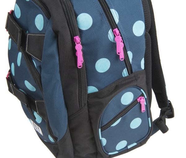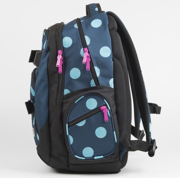 Priestranný dvojkomorový školský batoh vhodný pre 2. stupeň ZŠ a strednú školu s vystuženým vreckom pre notebook. V priestrannej hlavnej komore nájdete polstrovanú kapsu na notebook, v prednej potom praktický organizér a sieťované vrecko na zips. Ďalšie dve menšie zipsové vrecká poslúžia na úschovu ďalších drobností. Batoh má anatomicky tvarovaný, priedušný chrbát potiahnutý sieťovinou, široké a polstrované ramenné popruhy s hrudným pásikom, ktorý sa dá výškovo posúvať. Dve bočné vrecká sú vhodné pre fľašu s pitím alebo ďalšie nevyhnutnosti.