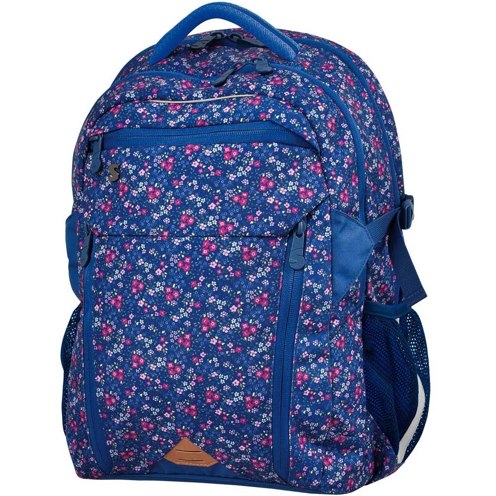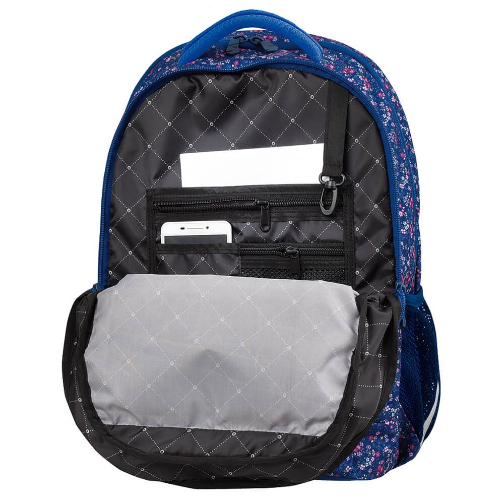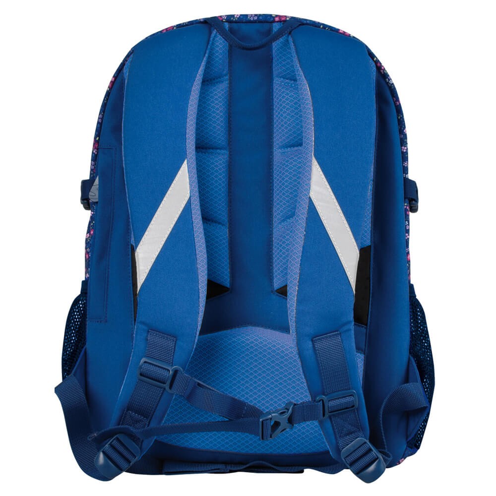 Dvojkomorový študentský batoh v modrej farbe s kvetinovým motívom je vhodný pre žiakov 2. stupňa ZŠ a študentov SŠ. Hlavná komora batohu je najpriestrannejšia a obsahuje oddelenú kapsu na tablet alebo notebook. Je navyše vybavená kompresnými páskami k jednoduchému a rýchlemu nastaveniu hĺbky. Pri jej plnom zaťažení upravuje ideálne rozloženie váhy na chrbte dieťaťa. Druhá komora tašky obsahuje praktický organizér s množstvom kapsičiek aj karabínkou na kľúče, predné 3 zipsové vrecká potom ponúkajú priestor pre ďalšie drobnosti. Bočné sieťované vrecká sú určené na prenášanie fľaše na pitie. Sú opatrené reflexnými prvkami, ktoré sa prelínajú celým batohom na zvýšenie viditeľnosti a bezpečnosti detí. Vďaka 3D chrbtovému systému batoh skvele sedí na chrbte a prispôsobí sa chrbtici dieťaťa. Systém Air Flow a priedušné polstrovanie umožní dobrú cirkuláciu vzduchu a príjemné nosenie. Polstrované nastaviteľné ramenné popruhy sú opatrené hrudným pásikom, pre zvýšenie komfortu pri nosení. Na prenášanie v ruke slúži pohodlné polstrované madlo.