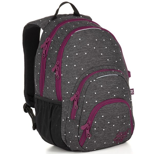 Batoh je ušitý z pevného štruktúrovaného polyesteru a ozdobený malými bodkami a odolnými zipsami fialovej farby s pogumovanými ťaháčikmi. Samozrejmosťou je polstrovaný, anatomicky tvarovaný chrbát s vyberateľnou hliníkovou výstuhou, ktorá drží pevný tvar chrbta batohu v správnom anatomickom prehnutí a navyše je ľahučká (0,06 kg), takže jej hmotnosť na chrbte neucítite. Pohodlné nosenie zaistia i anatomicky tvarované ramenné popruhy s hrudným pásikom. Opasok aj popruhy sú výškovo nastaviteľné. Užšia zadná komora je perfektná pre umiestnenie pevných dosiek, zošitov a tých najťažších učebníc. Študentky ocenia aj polstrovanú kapsu na notebook, vhodnú pre vášho elektronického miláčika do maximálnej veľkosti 15,4 ". Kto nepotrebuje nosiť notebook do školy, ten kapsu ocení napríklad práve na zošity alebo zložky. Na polstrovanom vrecku je potom našité ešte menšie, taktiež polstrované vrecko treba na tablet, mobil alebo powerbanku. Predná komora je veľmi široká, do tej sa vojde takmer všetko, napríklad aj veci na krúžky. Naviac ukrýva ešte sieťovú kapsu na zips pre všetky drobnosti, čo potrebujú mať dievčatá po ruke.