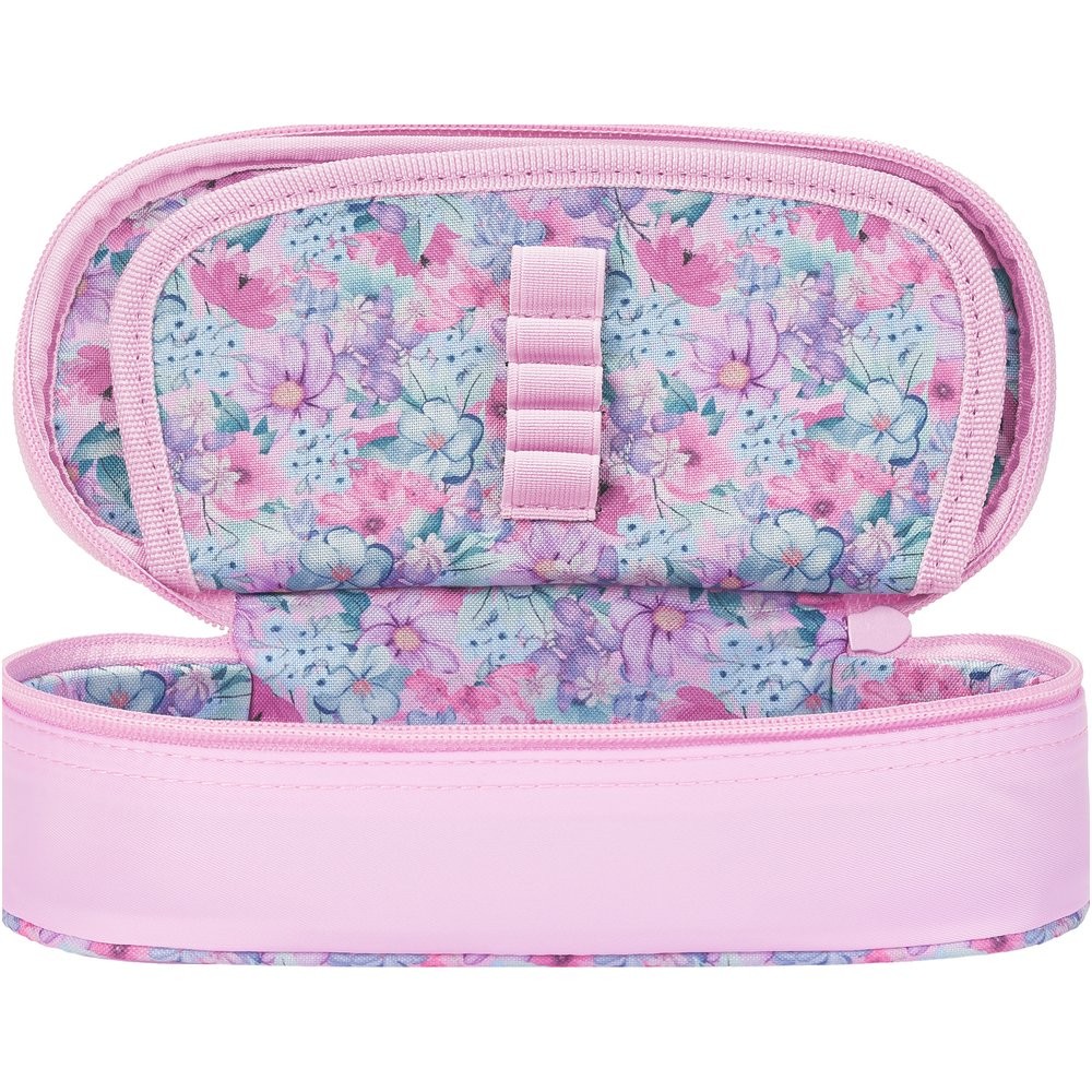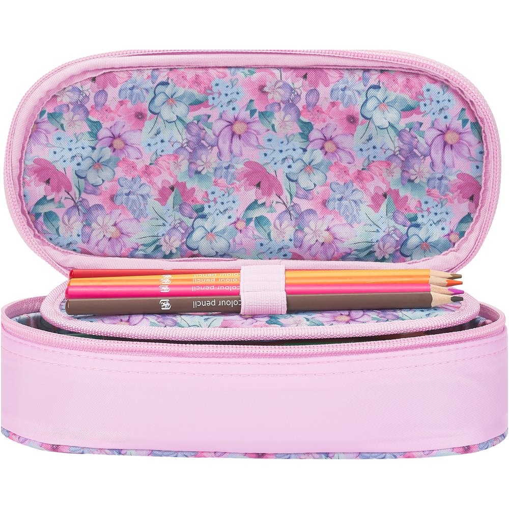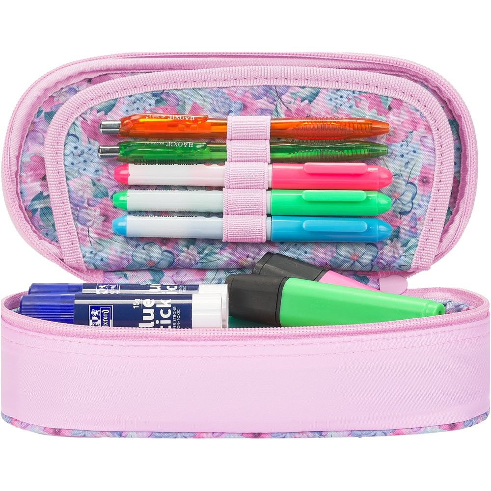 Štýlový peračník značky Oxford s kvetinami. Penál je z vodeodolnej polyesterovej tkanine, kvetinová podšívka vo vnútri puzdra. Klopa s integrovaným vreckom a pútkami na pero.