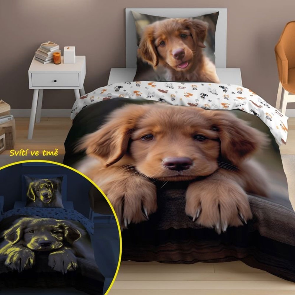 Obojstranné bavlnené svietiace obliečky pre deti s rotomilým šteniatkom. Obliečky na veľkú posteľ, obsahuje jednu obliečku na prikrývku a obliečku na vankúš, zapínanie je na zips. Detské obliečky pre dievčatká svieti po nasvietení na dennom svetle, svietiaci efekt sa môže začať vytrácať po 5 vypraniach.
