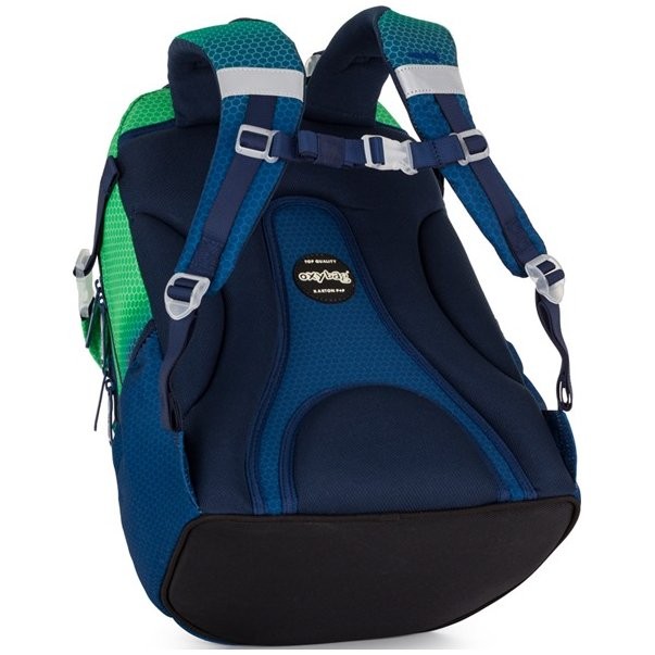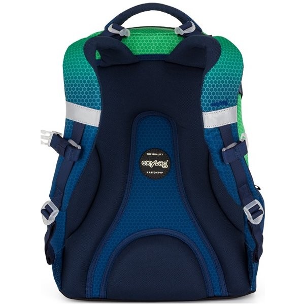 Školská taška z radu OXY Ombre Green je ideálny pre školákov od 5. triedy. Školský batoh je vhodný pre deti vysoké od 136 cm. Anatomicky tvarovaný chrbtový panel, polstrované ramenné popruhy a nastaviteľný hrudný popruh zaistí chrbát ako v bavlnke každému školákovi. Pevné dno zabraňuje prevrhnutiu samostatne stojaceho batohu. Študentský batoh disponuje dvoma priestrannými vreckami na všetky potrebné školské pomôcky. V bočných postranných vreckách na gumu je priestor na fľašu na pitie, ktorá je ľahko dostupná na doplnenie pitného režimu každého školáka. Do predného vrecka sa ľahko schová menšia desiata. Nechýba rad reflexných prvkov. Dĺžka chrbtového panelu je 43 cm