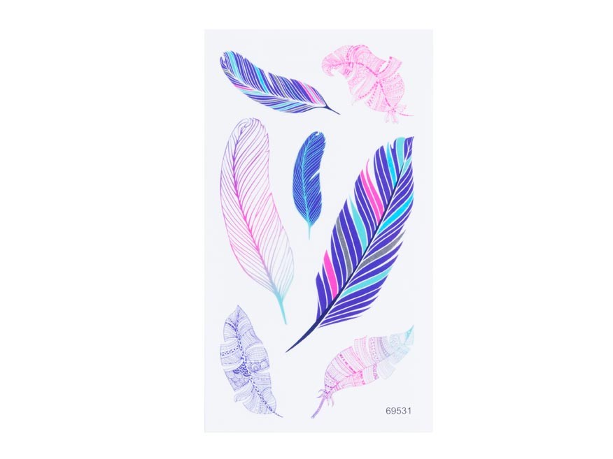 Tetovacie nálepky - perie. Tetovacie nálepky Farebné perie je vhodné na oslavy detí, večierky, karnevaly alebo ako darček pre priateľov.Inštrukcie:1. Vystrihnite zvolený motív a odstráňte kryciu fóliu.2. Stlačením obrázka vyčistite suchú pokožku.3. Zlete z vody zhora zhora, držte 20 sekúnd na pokožke a potom ho opatrne odstráňte.4. Nechajte vyschnúť 60 sekúnd.Tetovanie je možné odstrániť pomocou alkoholu, smotany, normálneho umývania alebo detského oleja.Cena je za 1 Armot.