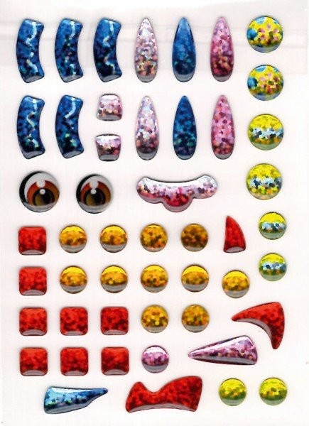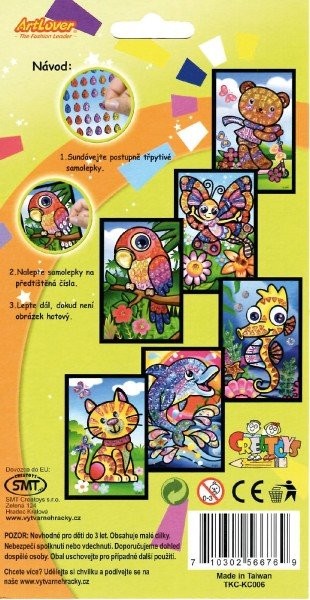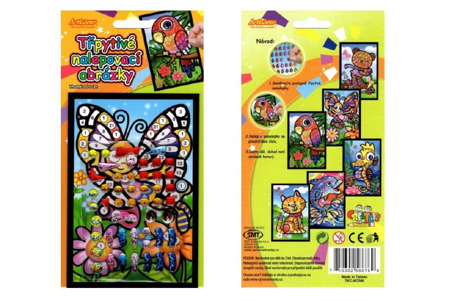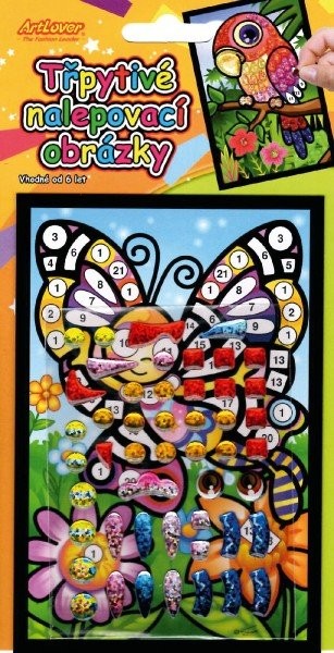 Na obrázky s natlačenými číslami nalepujú trblietavé samolepky. Vznikne nádherný farebný obrázok. Vhodné od 6 rokov.