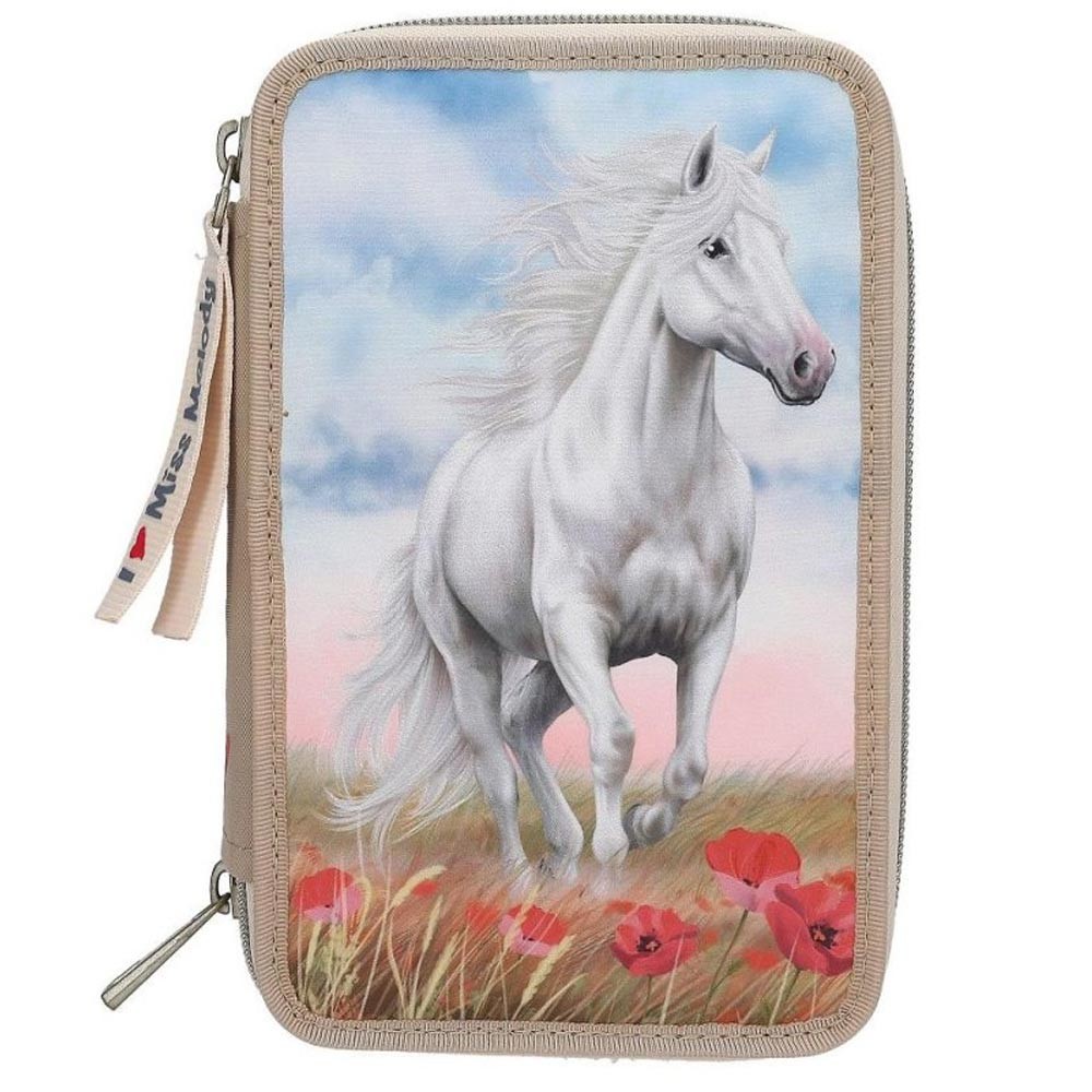Nádherný trojposchodový peračník do školy od Miss Melody z kolekcie Poppy Sand očarí všetkých milovníkov koní. Jemný romantický dizajn s ilustráciou koníka na rozkvitnutej lúke s vlčími makmi prenesie deti do sveta prírody a voľnosti.