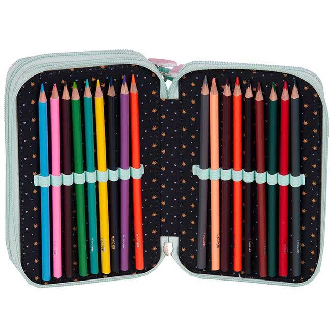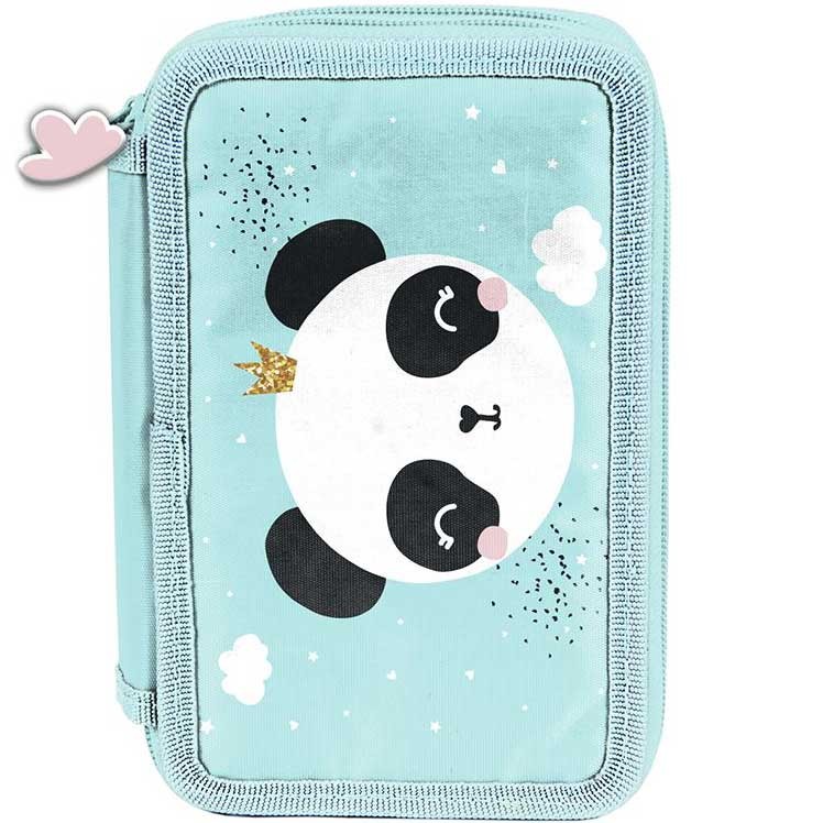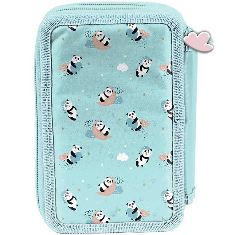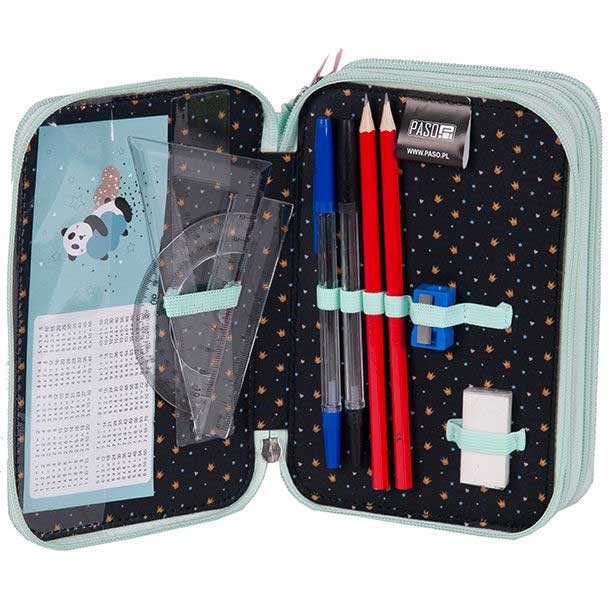 Trojposchodový peračníkpanda vybavený. Obsahuje: 2 perá, 2 ceruzky, strúhatko, gumu, pravítko 15 cm, malý trojuholník, uhlomer, malú násobilku, 9 tenkých linerov, 9 farebných fixiek, 18 farebných trojhraných ceruziek.