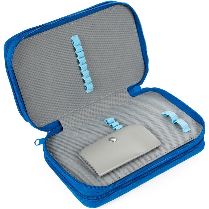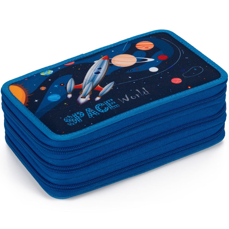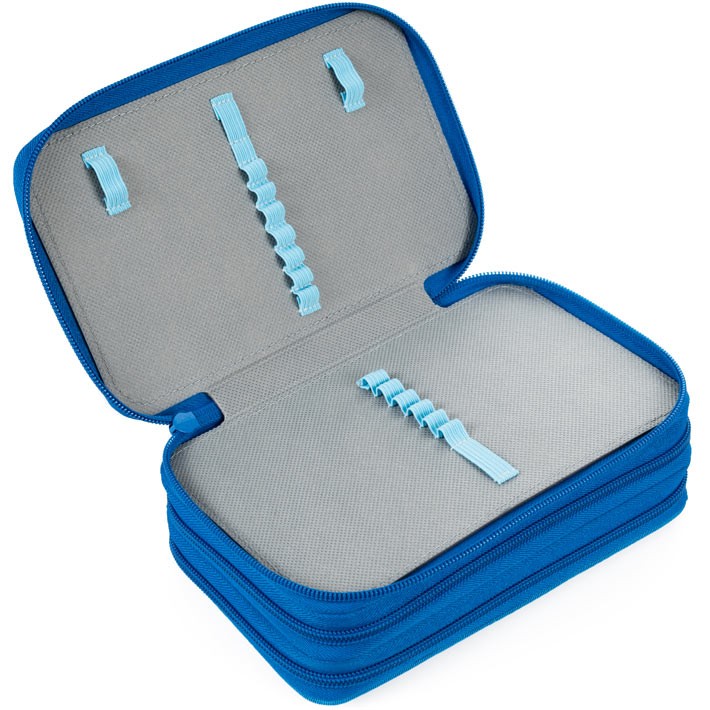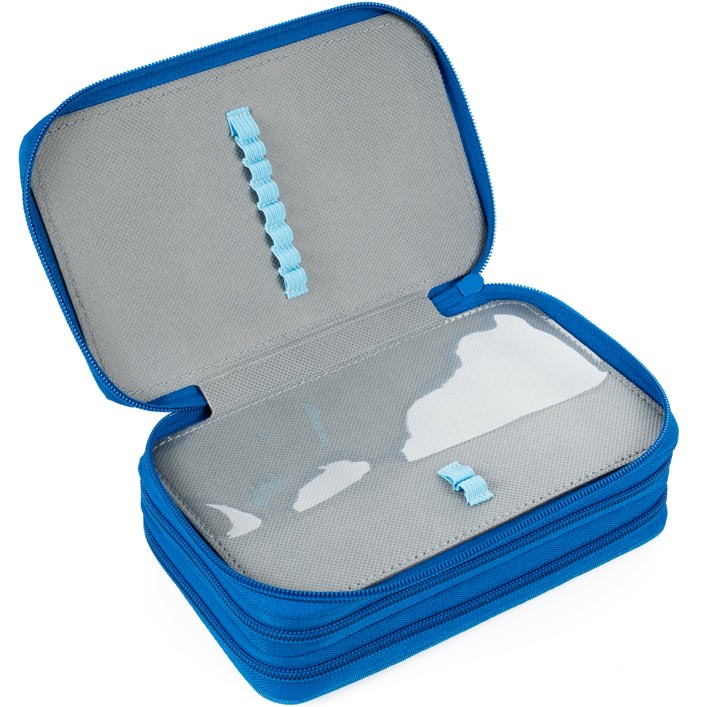 trojposchodový priestranný školský peračník pre chlapcov, prázdny. Na prvom poschodí je umiestnené priehľadné vrecko na rozvrh a 9 pevných gumičiek na písacie potreby rôznych veľkostí.