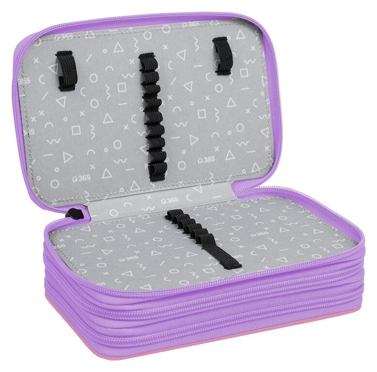 Prvé poschodie obsahuje 8 gumičiek na pastelky, 3 širšie gumičky na strúhadlo a gumu a novinkou je sieťovaná kapsička s pružným lemom na drobnosti.