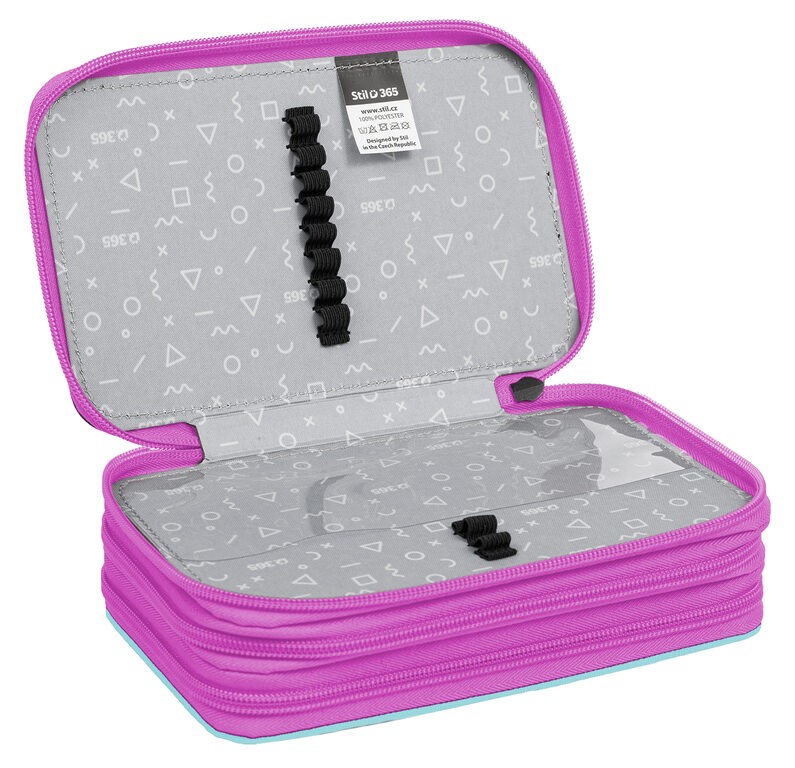 Druhé poschodie obsahuje priehľadnú kapsičku na rozvrh hodín a 10 pevných gumičiek pre rôzne písacie potreby.
