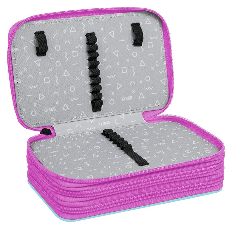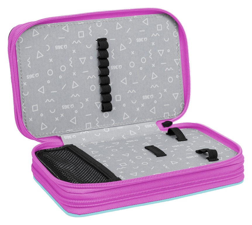 Prvé poschodie obsahuje 8 gumičiek na pastelky, 3 širšie gumičky na strúhadlo a gumu a novinkou je sieťovaná kapsička s pružným lemom na drobnosti.