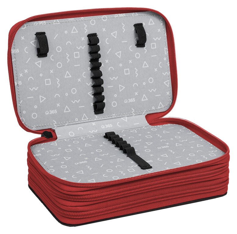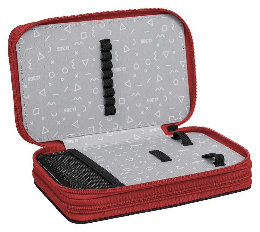 Prvé poschodie obsahuje 8 gumičiek na pastelky, 3 širšie gumičky na strúhadlo a gumu a novinkou je sieťovaná kapsička s pružným lemom na drobnosti.