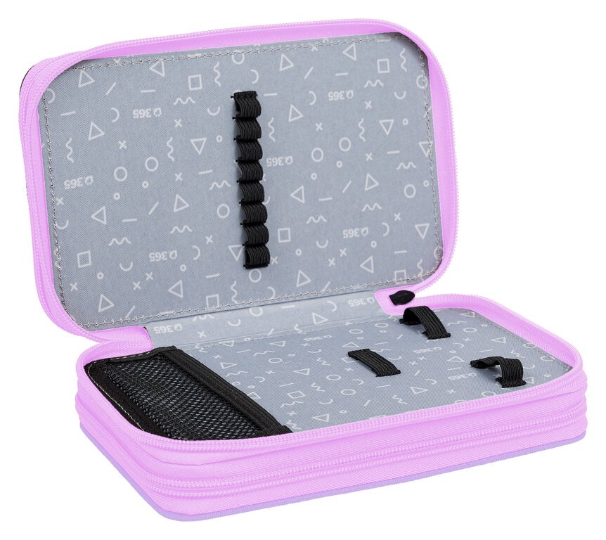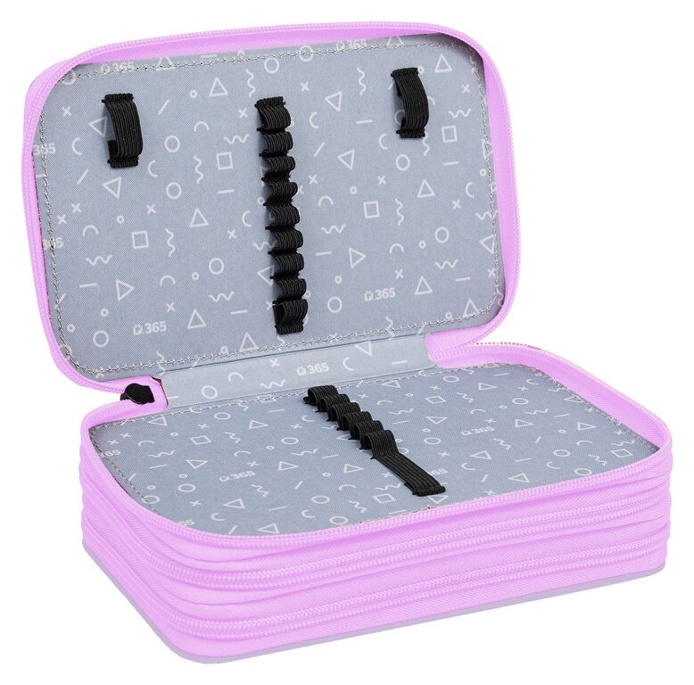 Prvé poschodie obsahuje 8 gumičiek na pastelky, 3 širšie gumičky na strúhadlo a gumu a novinkou je sieťovaná kapsička s pružným lemom na drobnosti.