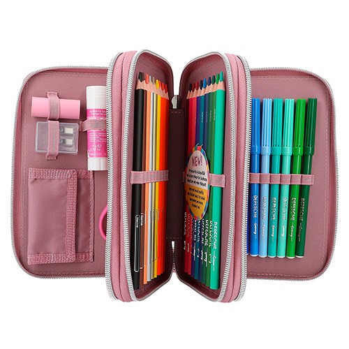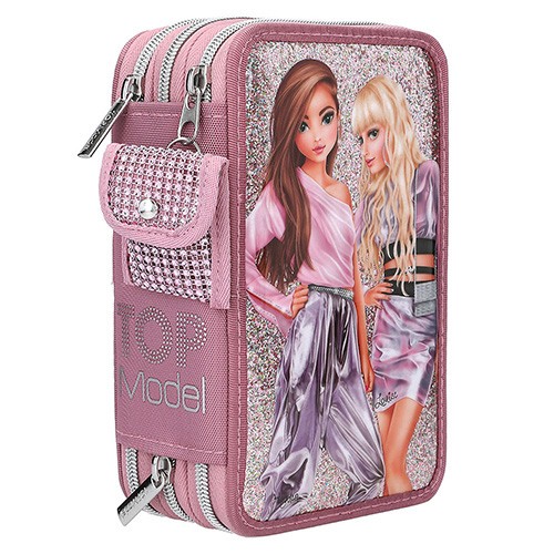 Praktický vybavený peračník Top Model trojposchodový, vyrobený z kvalitného materiálu, odolného proti bežnému opotrebovaniu. Pozdro má spoľahlivé bezporuchové zapínanie na zips. Peračník je zdobený flitrami a trblietavým vreckom na zipse.