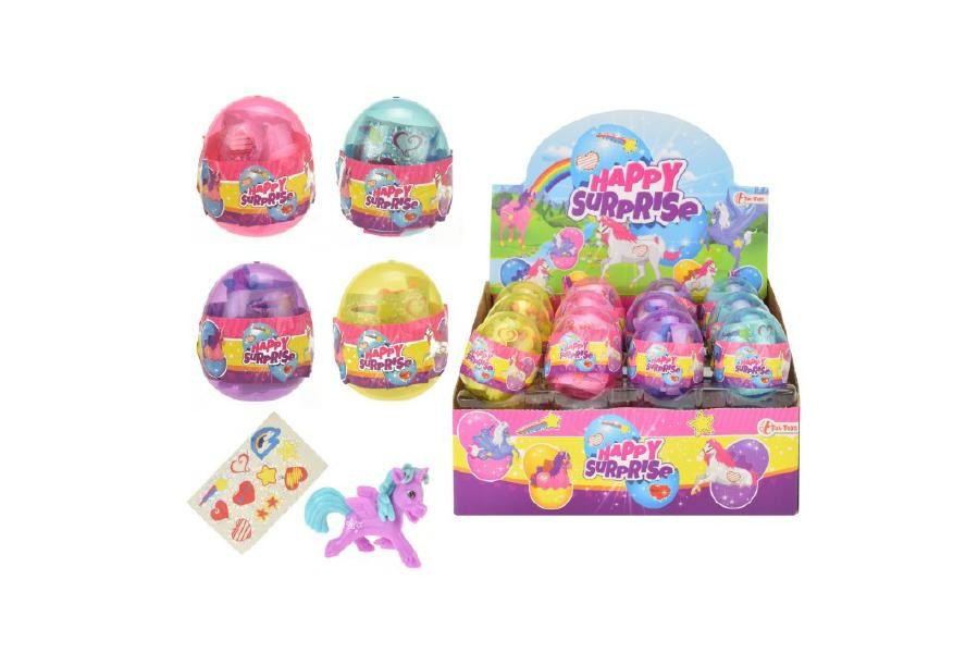 Malý plastový jednorožec, ktorý je ukrytý vo vajíčku. V balení sú aj samolepky, ktorými môžete ozdobiť svoju izbu.