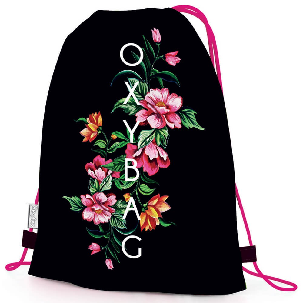 Elegantné športové vrecko dievčenské na chrbát s kvetinovým motívom a logom Oxybag. Vhodné do telocviku, pre športové využitie aj bežné nosenie. Materiál 100% polyester, rozmer: 36 x 44 cm, váha: 80 g.