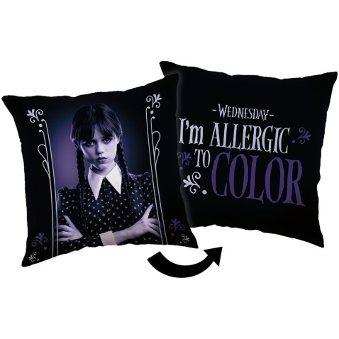 Licenčný vankúš Wednesday, hlavná hrdinka s nápisom “I am allergic to color“. Ideálne pre fanúšikov seriálu Wednesday od Tima Burtona, ktorý sleduje dobrodružstvo Wednesday Addamsovej na Nevermore Academy. Motív z oboch strán, z každej strany iný obrázok.