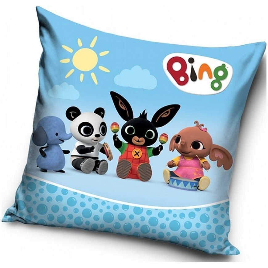 Licenčný vankúšik s motívom Zajačika Binga a jeho priateľov ladený do svetlo modrej farby. Vankúšik sa skladá z obliečky so zipsom a plneného vankúšika z netkanej textílie.