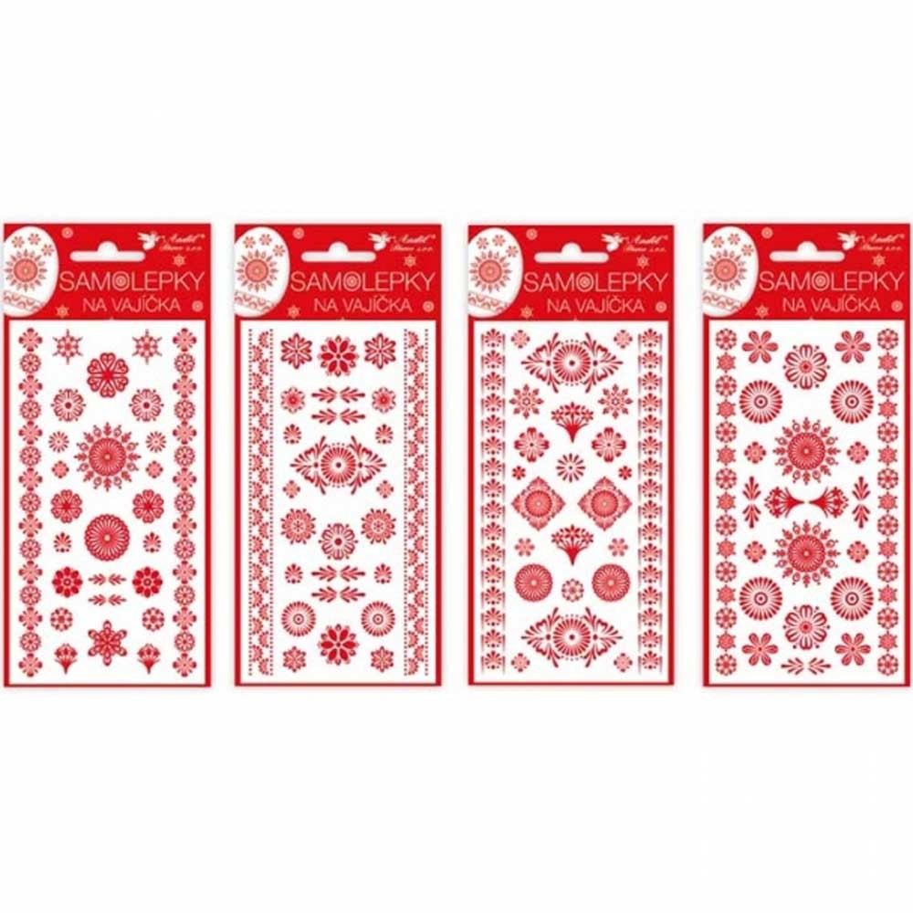 Červené gelové samolepky na vajíčka s veľkonočnými motívmi.