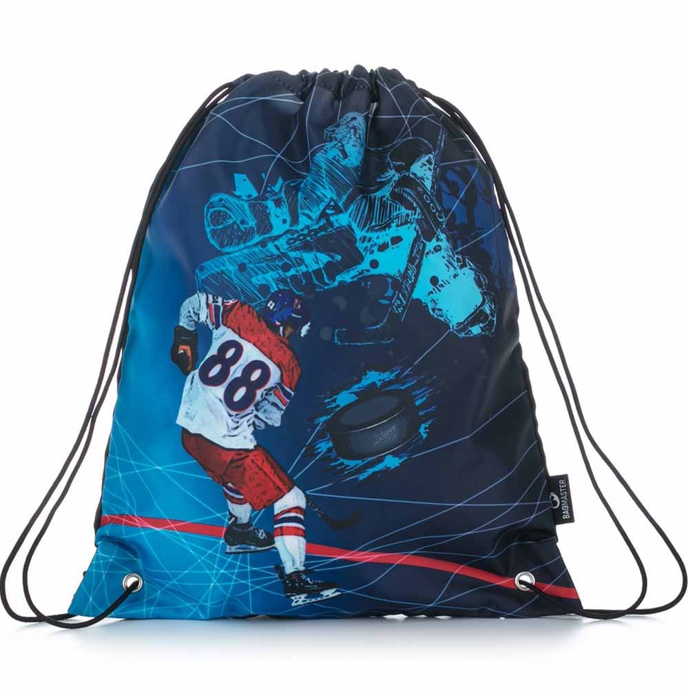Modré vrecko na prezúvky alebo športové veci s hokejovým motívom. Zatvára sa stiahnutím šnúrky. Sťahovacie šnúrky možno využiť aj ako ramenné popruhy a vak je možné nosiť ako batoh.