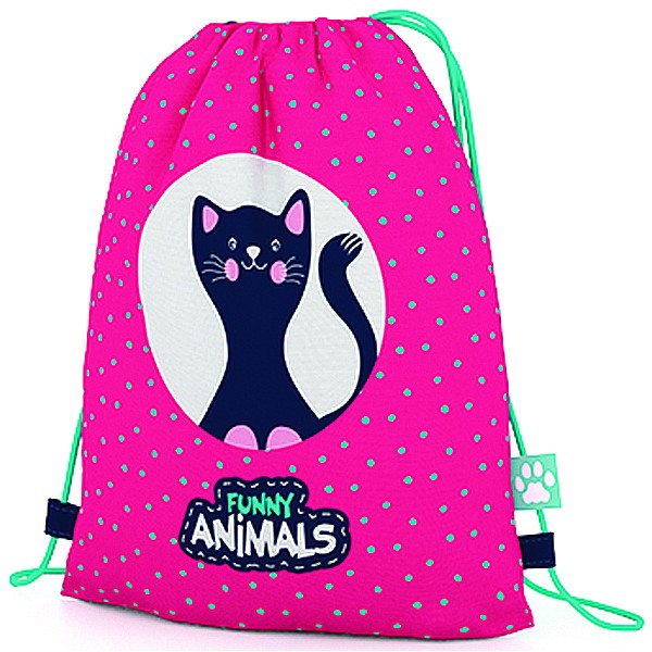 Textilné vrecko na športové potreby alebo prezúvky s motívom mačky. Dve postranné šnúrky zaistí pevné uzatvorenie a pohodlné nosenie cez ramená.