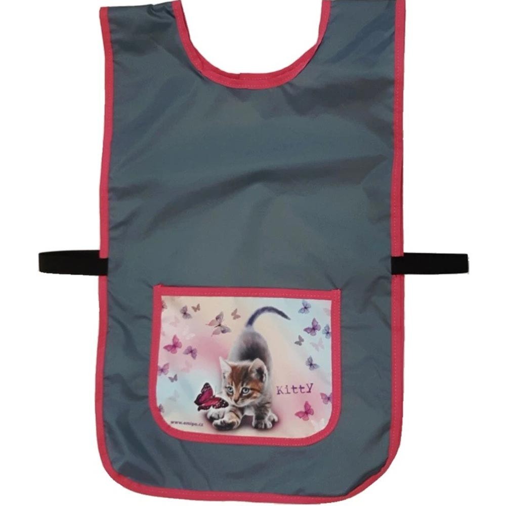 Dievčenská zásterka do výtvarnej výchovy je určená pre žiačky 1. stupňa. Oblieka sa cez hlavu, na bokoch sú diely spojené širokou gumou. Na prednej strane má veľkú kapsu s motívom mačiek a myšiek. Zásterku odporúčame prať v ruke alebo nečistoty zotrieť vlhkou handričkou.
