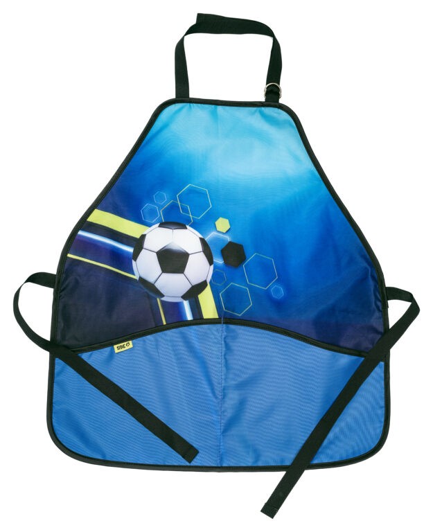 Zásterka do školy Football Stil sa navlieka nastaviteľným popruhom cez hlavu a zaviaže sa okolo tela pomocou šnúrok. Je vyrobená z umývateľného polyesterového materiálu, ktorý sa ľahko udržuje. Na prednej strane sú 2 vrecká na výtvarné pomôcky. Hlavná časť zásterky je potlačená obrázkami v školských dizajnoch, ladiacich k školskej kolekcii.